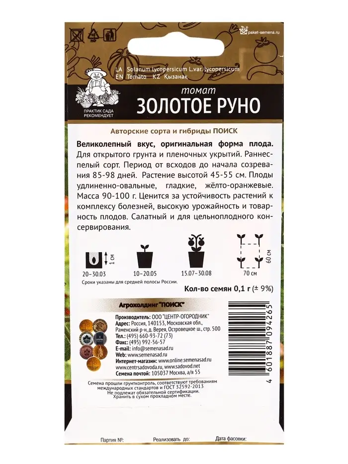Семена томатов «Золотое руно» относятся к раннеспелому сорту, предназначенному для открытого грунта и плёночных теплиц. Период от всходов до начала созревания составляет 85‒98 дней.