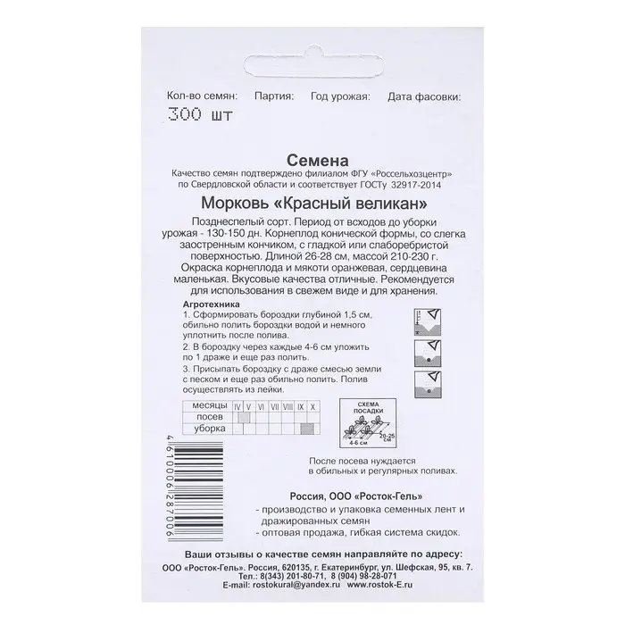 Агротехника: Морковь лучше растет на легких суглинистых и супесчаных почвах. Лучшими предшественниками считаются картофель, лук, томаты, огурцы, бобовые. Весной перед посевом в почву вносят комплексное минеральное удобрение, обеспечивающее необходимое питание овощным культурам в период всей вегетации. Посев в конце апреля в бороздки на глубину 2-3 см. Расстояние между рядами 18-20 см. Семена в драже! Для того чтобы облегчить посев и выращивание мелкосемянных культур, была разработана система покрытия каждого семечка специальным составом. При попадании влаги оболочка рассыпается.
