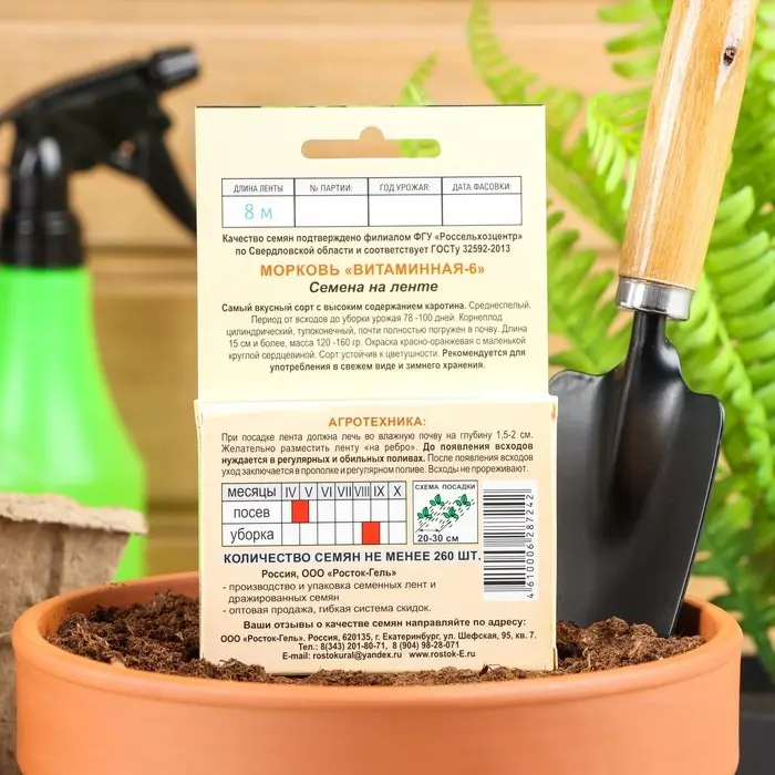 Семена на ленте – очень просто и удобно! Семена тщательно подготовлены к посеву и находятся между двумя тонкими слоями ленты, полностью растворимой во влажной среде. Материал ленты – 100% целлюлоза, не содержит клея. Технология запатентована. Общая длина ленты – 8 м. Лента состоит из трех частей. Перед использованием их нужно отделить друг от друга и расправить. Длина каждой части – 2,67 м. На каждой части располагаются ≈ 80 семян моркови (всего ≈ 240 шт.).