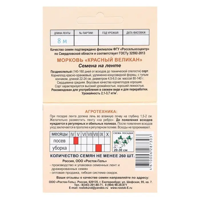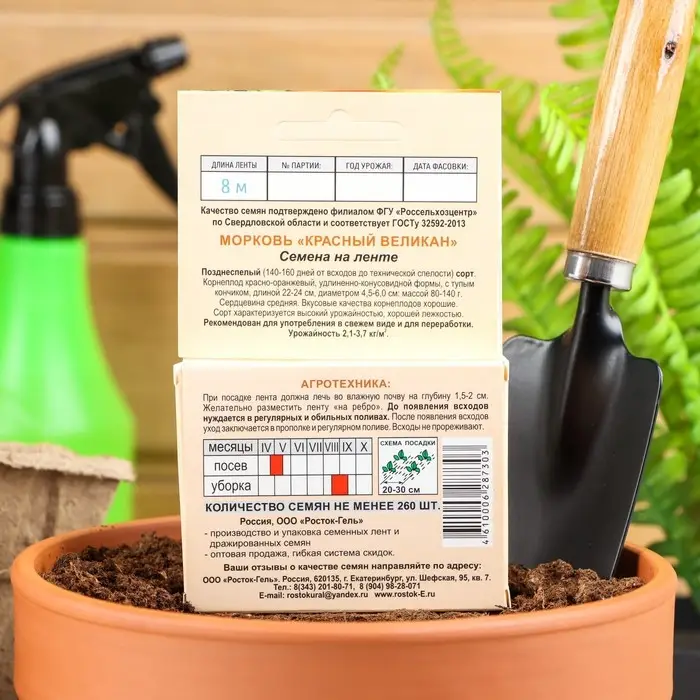 Суперурожайный среднеспелый сорт. Полностью убирают урожай на 100-120 день после всходов. Корнеплоды гладкие, выровненные, длиной до 25 см. Сорто тип Флакке. Сердцевина небольшая. Мякоть красно-оранжевая, очень вкусная, сладкая и сочная. Подходит для приготовления сока. Сорт холодостойкий, неприхотливый, устойчив к цветушности и растрескиванию корнеплодов. Отлично хранится до нового урожая. Один из лучших для подзимнего посева. Агротехника. Перед посевом почву разрыхляют. Ленту помещают в хорошо увлажненные бороздки на подготовленной грядке, на глубину 1,5-2 см и засыпают грунтом, поливают. До появления всходов грядку накрывают пленкой, поддерживая верхний слой почвы во влажном состоянии (не допуская пересыхания ленты). Благодаря идеальному расположению семян на ленте (на расстоянии 3-3,5 см) всходы не требу-ют прореживания, и растения могут равномерно развиваться. Дальнейший уход заключается в прополках, поливах и рыхлении почвы. Наслаждайтесь сладкой и здоровой морковью со своего огорода!