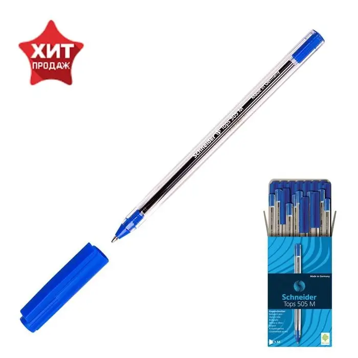 Набор шариковых ручек Schneider Tops 505 M в шестигранном прозрачном корпусе с синим колпачком под цвет чернил. Длина линии письма - 3500 м. Письменные принадлежности Schneider разрабатываются и производятся только в Германии.