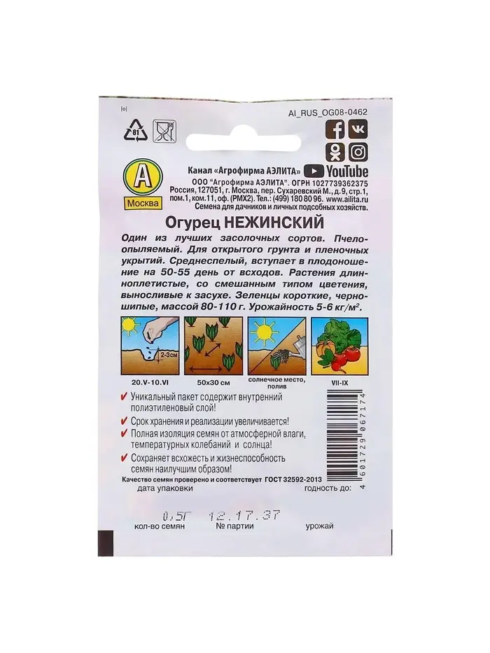 Семена Огурец "Нежинский", "Лидер", пчелоопыляемый, 20 шт