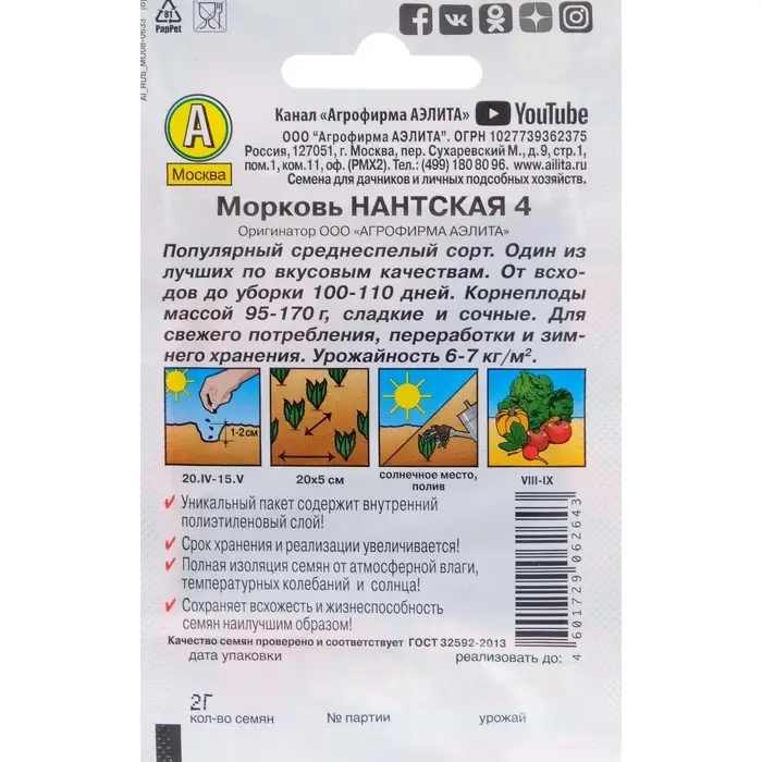 «Нантская 4» — это среднеспелый сорт моркови, у которого период от всходов до технической зрелости составляет 70–108 дней. Обладает устойчивостью к цветушности и высокой лёжкостью.