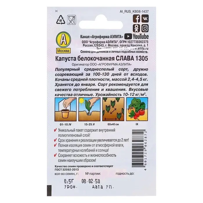 Семена Капуста белокочанная "Слава 1305" "Лидер", среднеспелый, 0,5 г ,