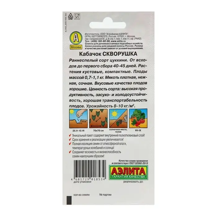 Раннеспелый сорт, формирует урожай за 45 дней от всходов. Ценится за высокую продуктивность, засухо- и холодоустойчивость. Растения кустовые, компактные. Плоды массой 0,7-1,1 кг. Мякоть кремовая, хорошего вкуса. Урожайность 8-10 кг/м2. Рекомендуется для столовых целей и консервирования.