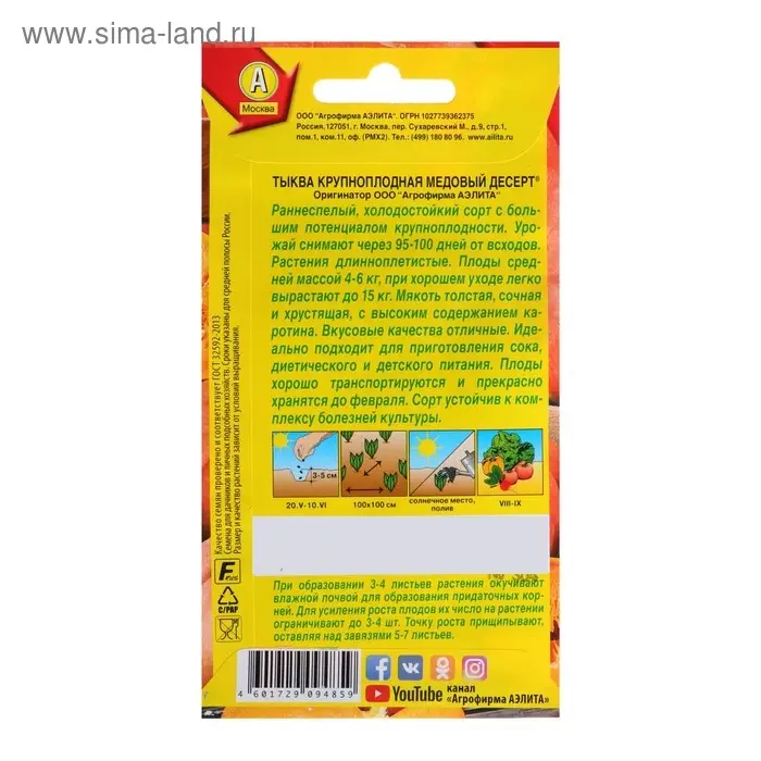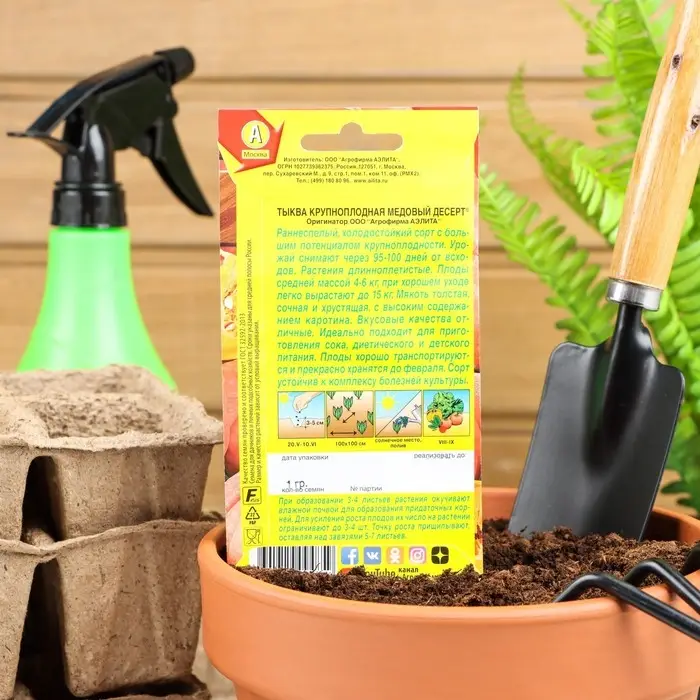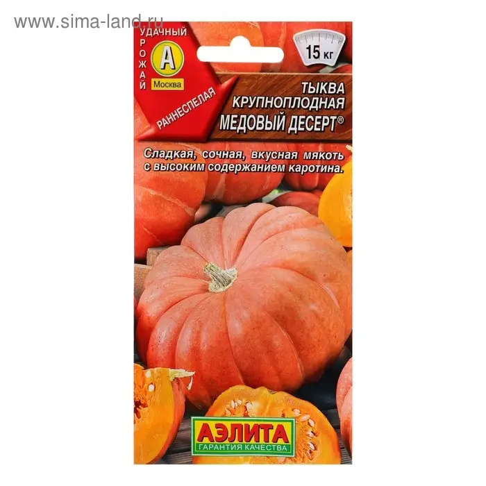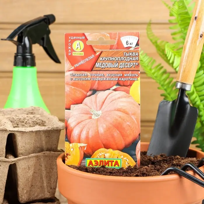 «Медовый десерт» — это раннеспелый сорт тыквы, у которого период от всходов до съёма плодов длится 95–100 дней. Устойчив к болезням культуры. Урожайность составляет 6–10 кг/м².