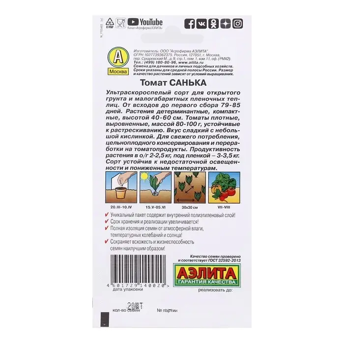 Семена Томат "Санька", ультраскороспелый, детерминантный,низкорослый,20шт.
