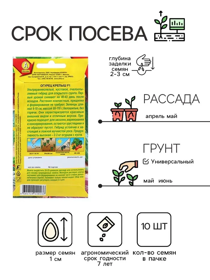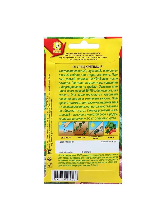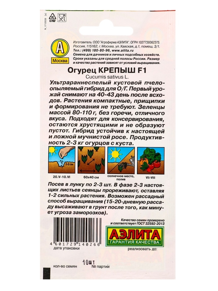 Семена Огурец "Крепыш" F1, раннеспелый, пчелоопыляемый, 10 шт