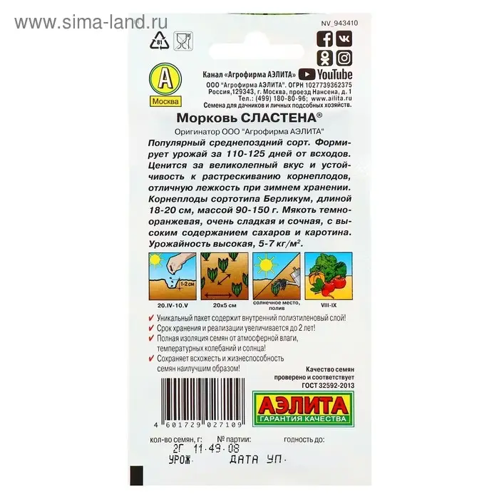 Семена Морковь "Сластена", 2 г