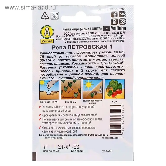 Сладкая сочная мякоть подходит для употребления в свежем виде, либо для приготовления диетических легкоусвояемых блюд. Репа «Петровская» отлично подходит для хранения — она будет ценным источником витаминов осенью и зимой.