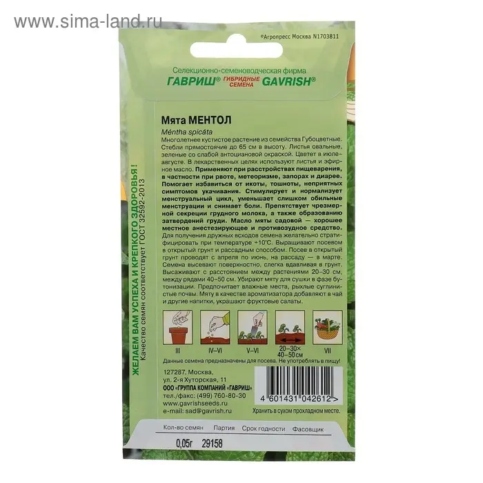 Семена Мята садовая "Ментол", ц/п, 0,05 г