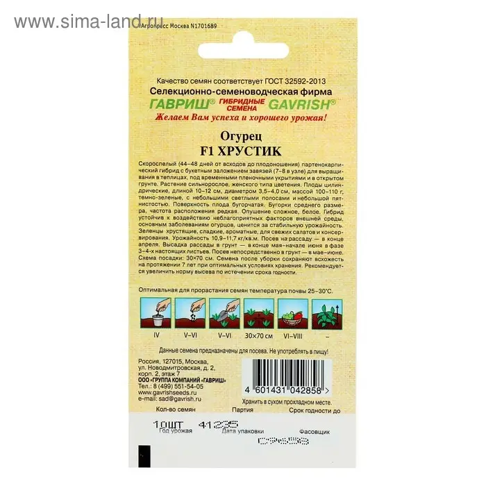 «F1 Хрустик» — это скороспелый партенокарпический гибрид с букетным заложением завязей, у которого период от всходов до плодоношения составляет 44–48 дней. Устойчив к воздействию неблагоприятных факторов внешней среды, основным заболеваниям огурцов, а также ценится за стабильную урожайность. Предназначен для теплиц, временных плёночных укрытий и открытого грунта.