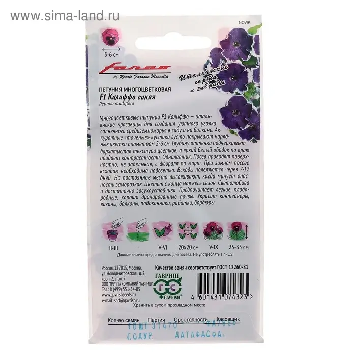 Многоцветковые петунии F1 Калиффо — итальянские красавицы для создания уютного уголка солнечного средиземноморья в саду и на балконе. Аккуратные «точеные» кустики густо покрывают нарядные цветки диаметром 5 см. Глубину оттенка подчеркивает бархатистая текстура цветков, а яркий белый ободок по краю придает контрастности. Посев проводят поверхностно, не заделывая, с февраля по март. При зимнем посеве всходам необходима подсветка. Всходы появляются через 7-12 дней. На постоянное место высаживают, когда минует опасность заморозков. Цветет с конца мая весь сезон. Светолюбива и достаточно засухоустойчива. Предпочитает легкие, плодородные, хорошо дренированные почвы. Украсит контейнеры, вазоны, балконы, подоконники, рабатки, бордюры.