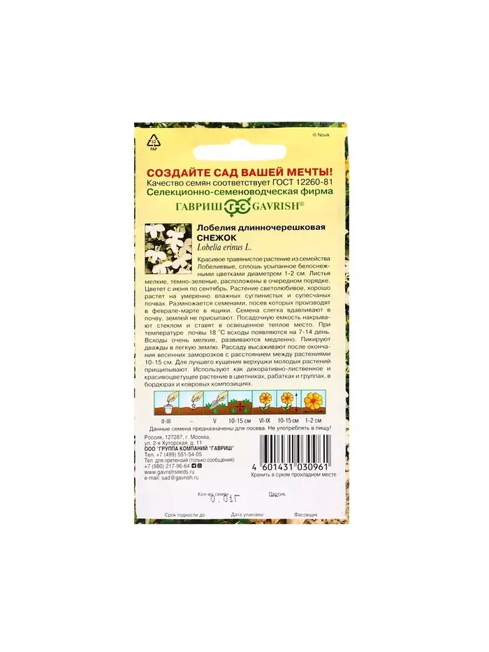 Семена цветов Лобелия "Снежок", ц/п, О, 0,01 г