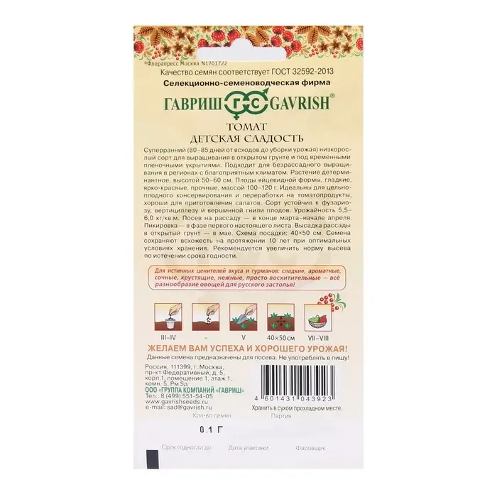 «Детская сладость» — это суперранний низкорослый сорт, у которого период от всходов до уборки урожая составляет 80–85 дней. Устойчив к фузариозу, вертициллёзу и вершинной гнили плодов. Предназначен для открытого грунта и временных плёночных укрытий. Подходит для безрассадного выращивания в регионах с благоприятным климатом.
