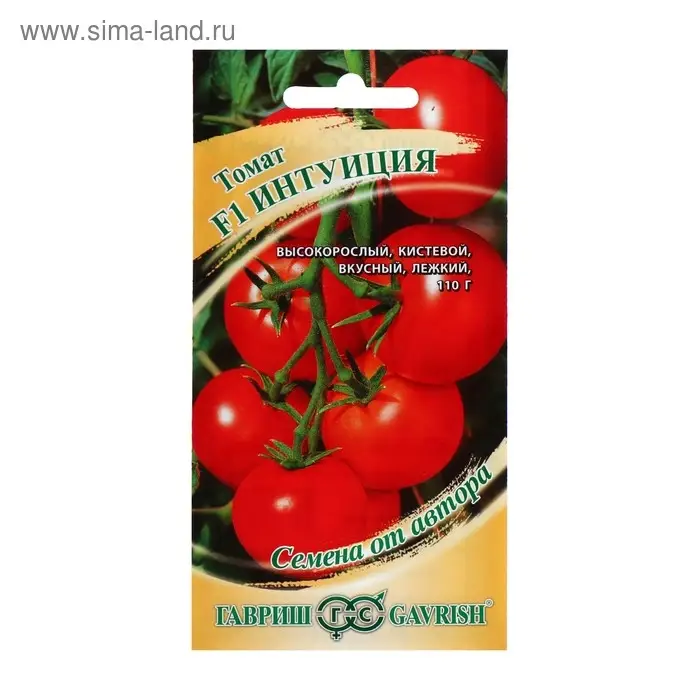 «Интуиция» имеет круглый светло-красный плод массой 100–110 г. Прекрасно подходит для консервирования и свежих салатов. Отличительная особенность — высокая устойчивость к вирусу табачной мозаики, кладоспориозу, фузариозу, растрескиванию и вершинной гнили. Урожайность — 4,5–5,5 кг/м2.