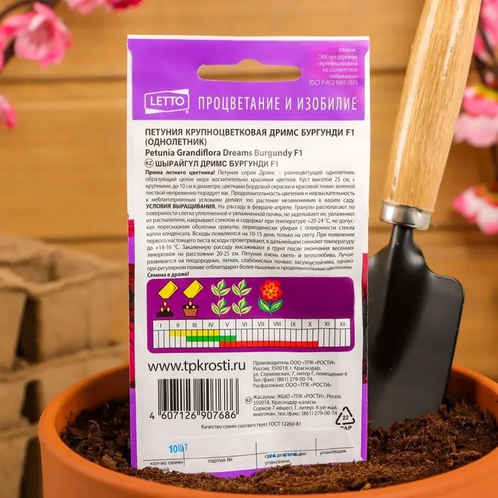 Растение крепкое, компактное, с хорошей ветвистостью, прекрасно разрастается и замечательно восстанавливается после дождя и ветра. Крупные, воронковидные цветы насыщенного цвета бургунди добавят яркие, сочные краски цветникам, бордюрам, вазонам и балконным ящикам. Петунии серии Дримс отличаются очень ранним и обильным цветением, устойчивостью к неблагоприятным погодным условиям и поражению болезнями.