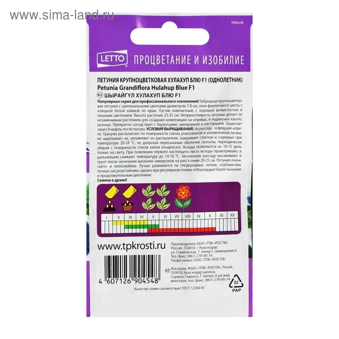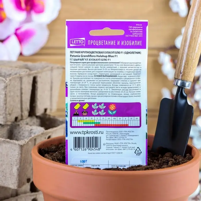 Особенности выращивания: На рассаду февраль-апрель. Гранулы располагают по поверхности слегка уплотненной и увлажненной почвы, не заделывая их, увлажняют из распылителя, накрывают стеклом и содержат при температуре 20-24°С, не допуская пересыхания оболочки гранулы периодически убирая с поверхности стекла капли конденсата. Всходы появляются на 10-15 день только на свету. При появлении первого настоящего листа всходы проветривают и в дальнейшем снижают температуру до 14-16°С. Закаленную рассаду высаживают в грунт после окончания весенних заморозков на расстоянии 15-20 см. Петуния очень светолюбива и теплолюбива. Лучше развивается на плодородных, легких, слабокислых почвах, засухоустойчива, однако при регулярном поливе отблагодарит более пышным и продолжительным цветением.