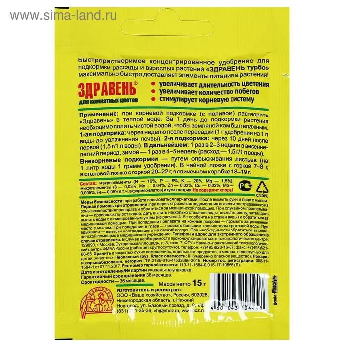 «ЗДРАВЕНЬ ТУРБО» увеличивает число побегов и листьев, способствует длительному и обильному цветению, более яркой окраске цветов и листьев. Укрепляет иммунитет растений и снижает негативное влияние ошибок в уходе.