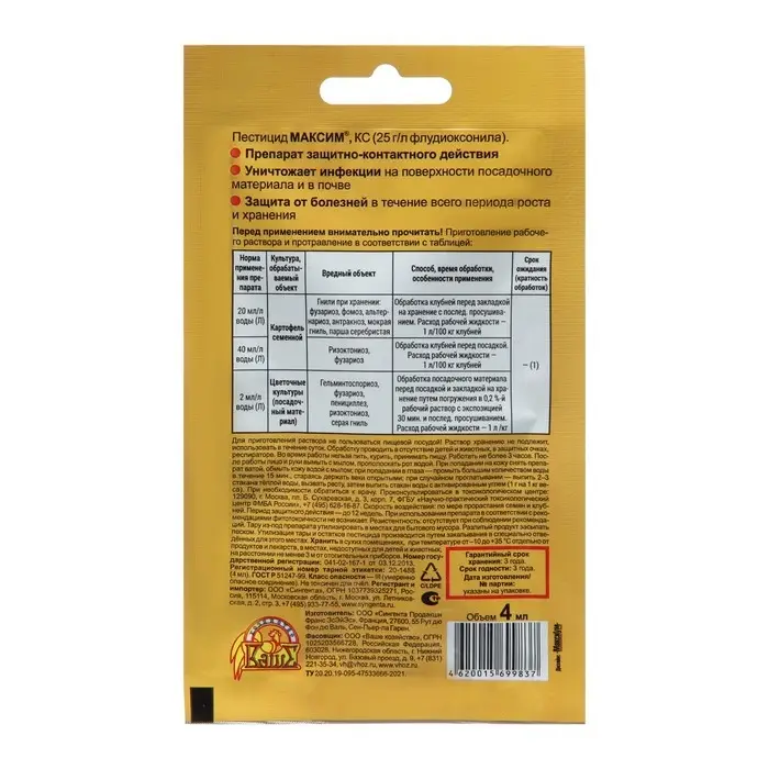 «Максим» — Препарат защитно-контактного действия для защиты от болезней луковичных (тюльпаны, гладиолусы, лилии и т.д.), георгинов, пионов, корней и корневищ других цветов, а также семенного картофеля. Создает защитный барьер на поверхности посадочного материала и в прикорневой зоне в почве. Эффективен против всех видов гнилей, плесени, фузариоза, ризоктониоза, парши и других заболеваний. Защищает растения от болезней в течение всего периода роста и хранения.