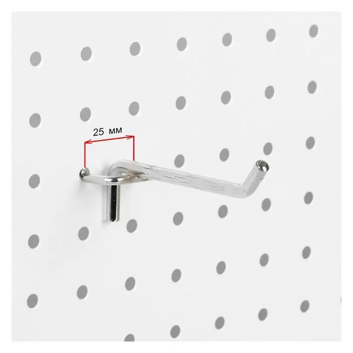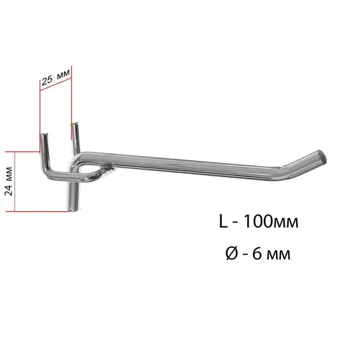 Крючок одинарный для металлической перфорированной панели, d=6 мм, L=10 см, шаг 25 мм, цвет хром