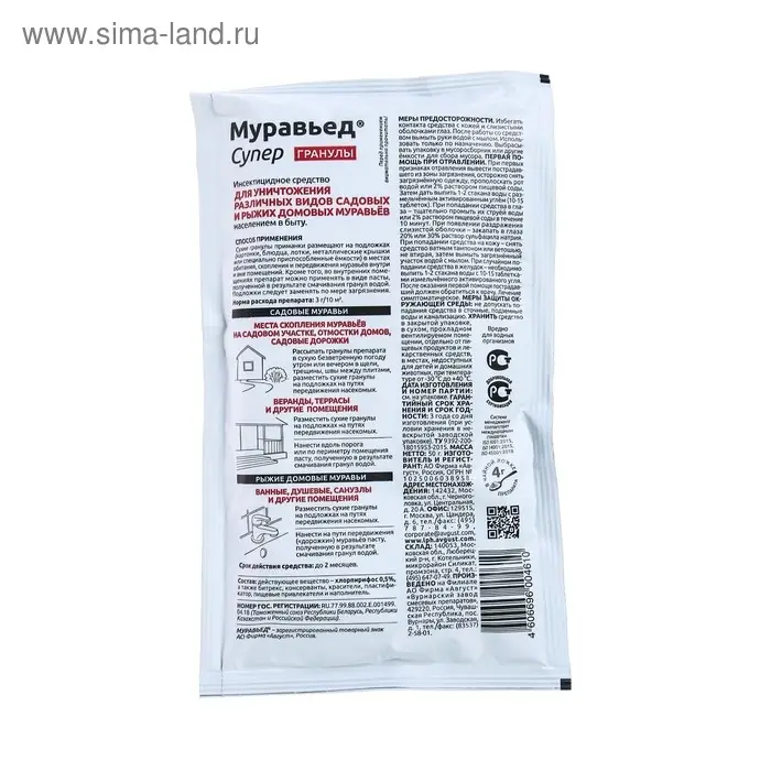 имеет высокую эффективность при попадании на муравьев или поедании ими обработанных культур;