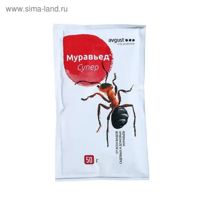 Муравьед – инсектицид контактно-кишечного действия против муравьёв. Попадая с пищей в организм муравьёв, он воздействует на нервную систему насекомых, вызывает паралич и уже в течение первых трёх суток после обработки неминуемо приводит к их гибели.