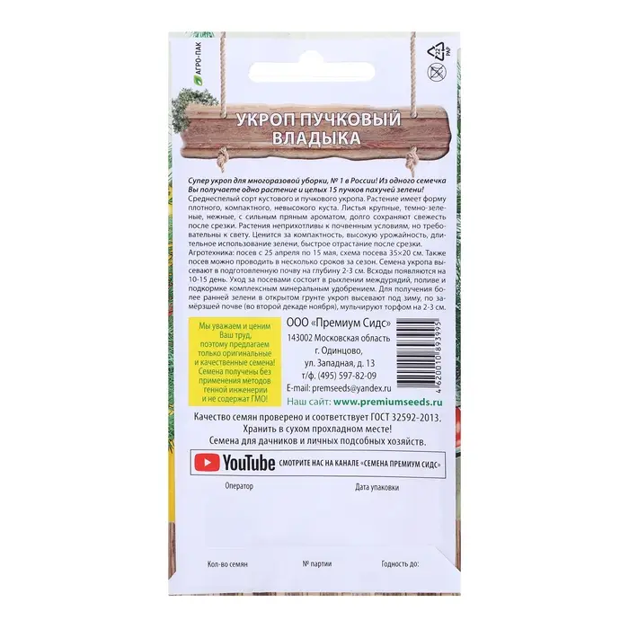 Агротехника: Посев с 25 апреля по 15 мая, схема посева 351520 см. Так же посев можно проводить в несколько сроков за сезон. Семена укропа высевают в подготовленную почву на глубину 2-3 см. Всходы появляются на 10-15 день. Уход за посевами состоит в рыхлении междурядий, поливе и подкормке комплексным минеральным удобрением. Для получения более ранней зелени в открытом грунте укроп высевают под зиму, по замёрзшей почве (во второй декаде ноября), мульчируют торфом на 2-3 см.