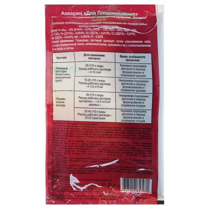 «Акварин для плодоношения» — это уникальное водорастворимое удобрение с оптимально сбалансированным комплексом макро- и микроэлементов. Оно предназначено для подкормок овощных и декоративных растений, вступающих в фазу плодоношения. Средство представляет собой смесь гранул и порошка бело-зелёного цвета.