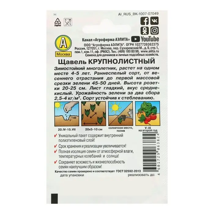 Благодаря внутреннему полиэтиленовому слою пакет не пропускает влагу и увеличивает срок годности семян до 2 лет.