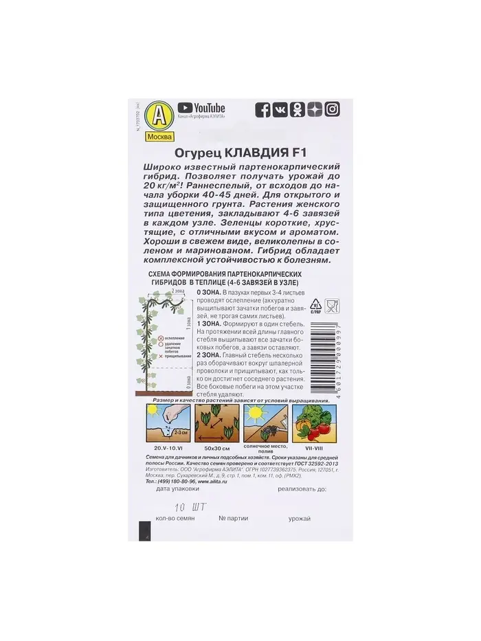 Семена Огурец "Клавдия F1", раннеспелый, партенокарпическии, 10 шт