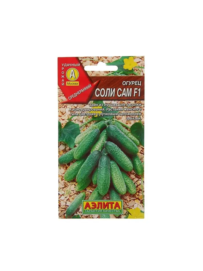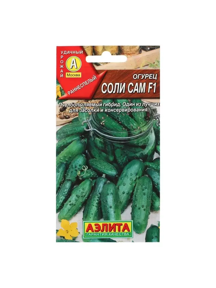 «Соли сам» — это новый раннеспелый пчелоопыляемый сорт женского типа цветения, предназначенный для выращивания в открытом грунте и плёночных укрытиях. Мелкобугорчатые цилиндрические ароматные корнишоны длиной 8–10 см идеально подходят для засолки и маринования. Сорт обладает повышенной устойчивостью к комплексу болезней.