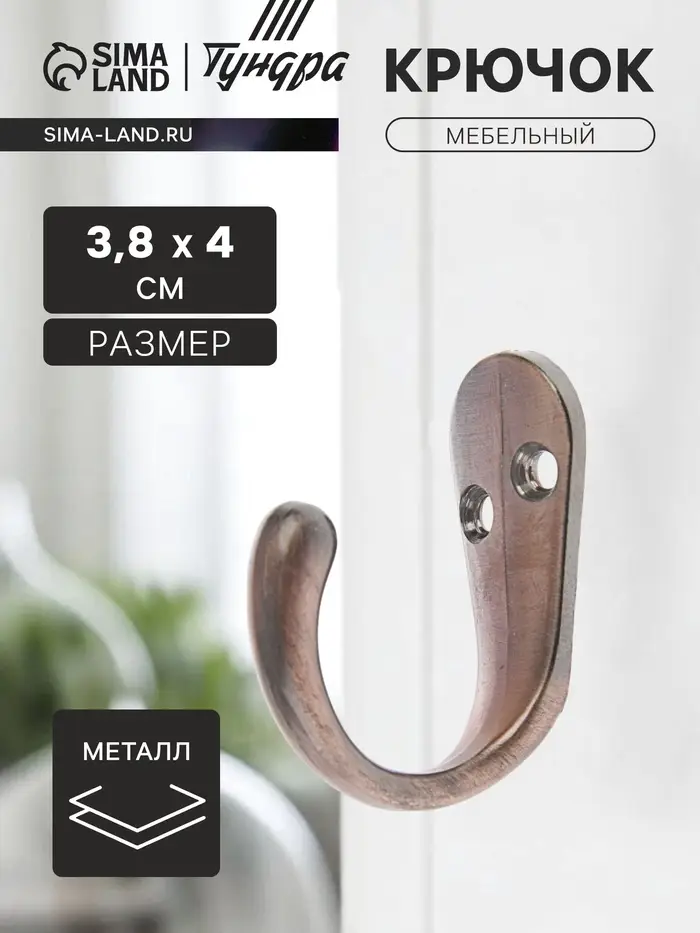Крючок мебельный ТУНДРА TKO008, однорожковый, медь