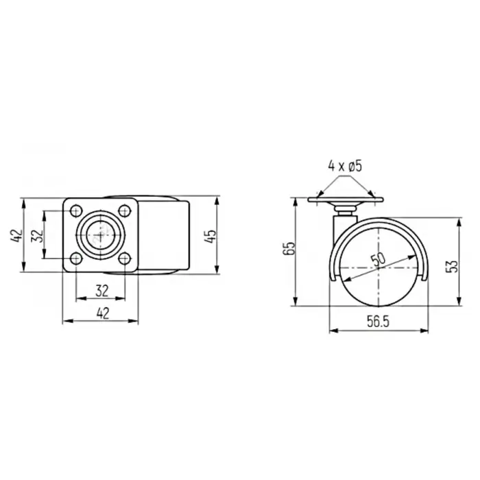 Колесо мебельное, d=50 мм, на площадке, без тормоза