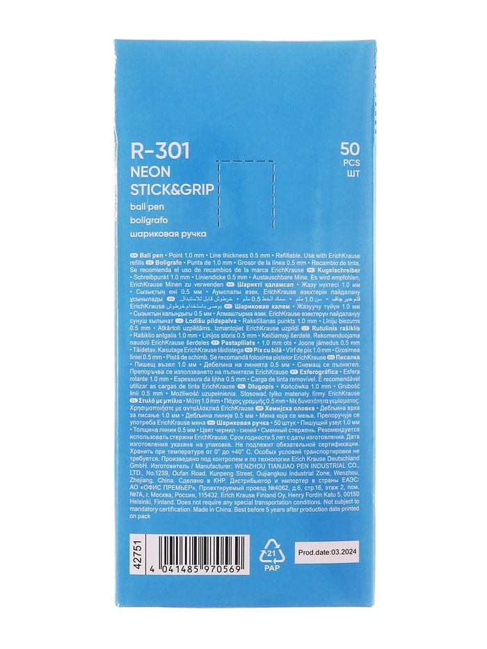 Ручка шариковая ErichKrause R-301 Neon Stick & Grip, узел 0,7-1.0 мм, чернила синие, резиновый держатель, длина линии письма 2000 метров, МИКС