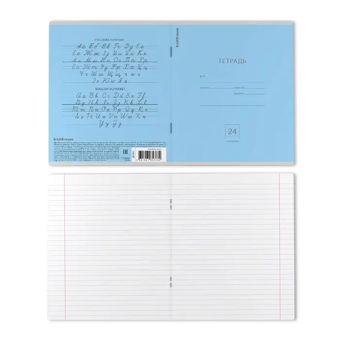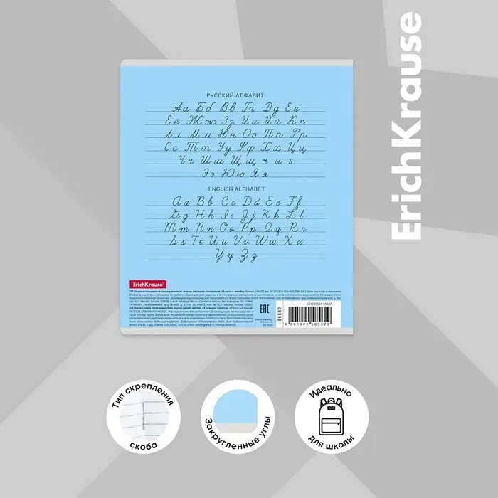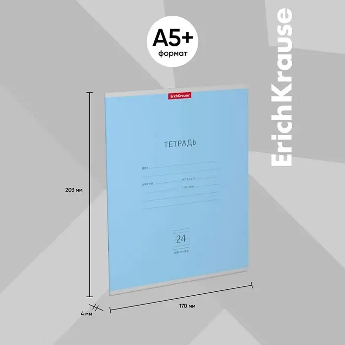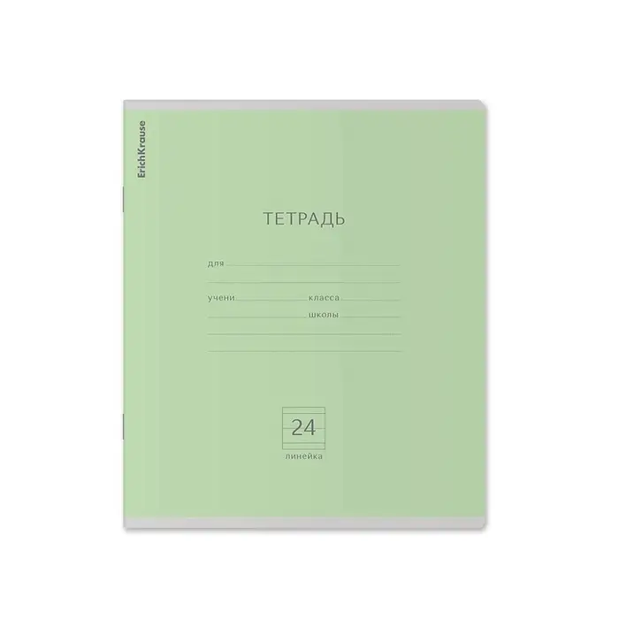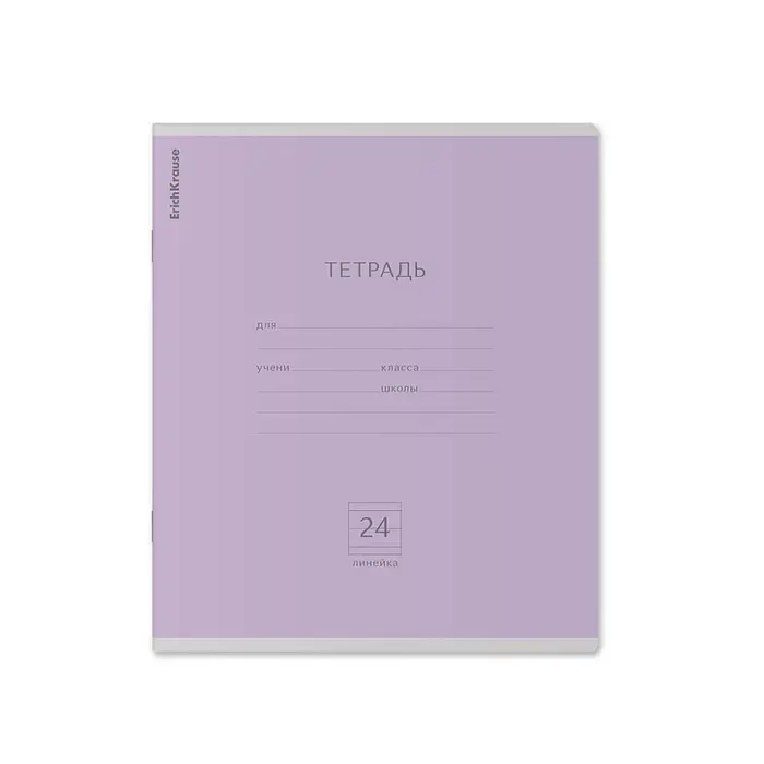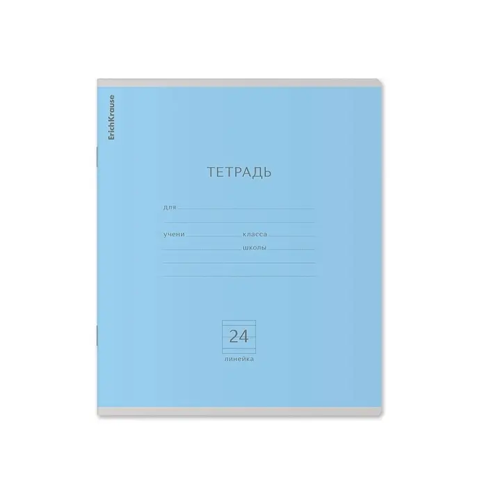 Тетрадь школьная ученическая формата А5+ (170х203 мм). Обложка из высококачественного мелованного картона плотностью 180 г/м2. В блоке 24 листа в линейку с полями. Бумага офсетная плотностью 60 г/м2. Цвет линовки - синий. Скругленные уголки обложки и блока. Тип скрепления - скоба. Тетради одного цвета упакованы в термоусадочную пленку по 10 штук.