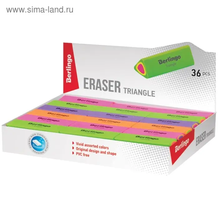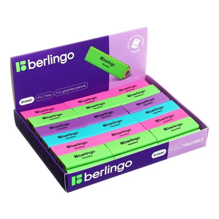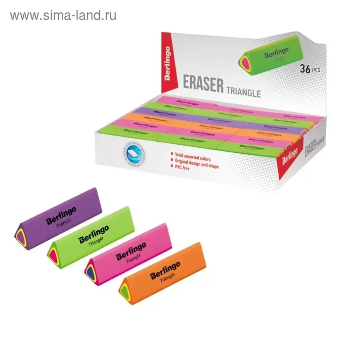 Ластик Triangle выполнен из высококачественной термопластичной резины. Каждый ластик имеет штрихкод. Упаковка в дисплей. 4 цвета ассорти.