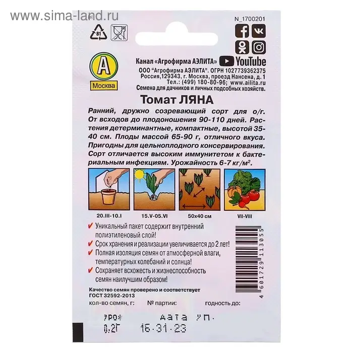 Семена Томат "Ляна" "Лидер", среднеспелый,детерминантный,низкорослый 0,2 г ,