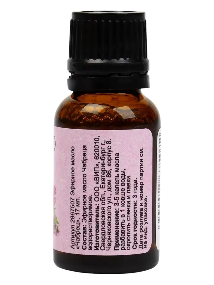 Эфирное масло чабреца оказывает расслабляющее и успокаивающее действие. Имеет приятный терпкий пряный аромат. Помогает при стрессе, бессоннице, головных болях, депрессии, простуде и других заболеваниях. Также масло улучшает кровообращение, укрепляет иммунитет и помогает при проблемах с кожей.
