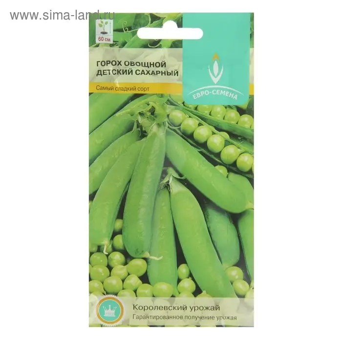 Раннеспелый высокоурожайный сахарный сорт. Растение высотой около 95 см. Бобы светло-зеленые, слабоизогнутые, широкие, без пергаментного слоя. В пищу используются не только семена, но весь боб (в просторечии – стручок) целиком, вместе со створками – как в свежем виде, так и после легкой кулинарной обработки. Створки боба не имеют жесткого пергаментного слоя, они нежные на вкус, сочные, сладкие. Сорт пригоден для консервирования и замораживания. Вкусовые качества свежего и консервированного горошка отличные. Устойчив к фузариозу.