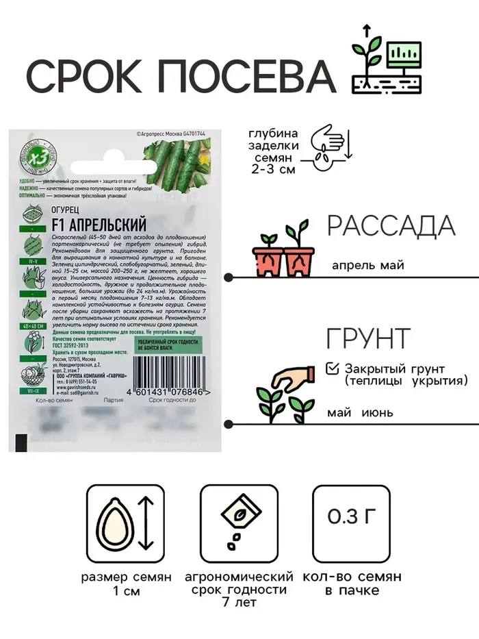 Семена Огурец "Апрельский" F1, скороспелый, партенокарпический, 0,3 г серия ХИТ х3
