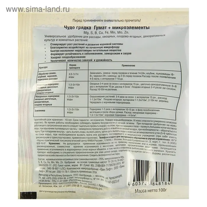 Состав: калиевые и/или натриевые соли гуминовых кислот – 75%, микроэлементы Mg, S, B, Cu, Fe, Mn, Mo, Z