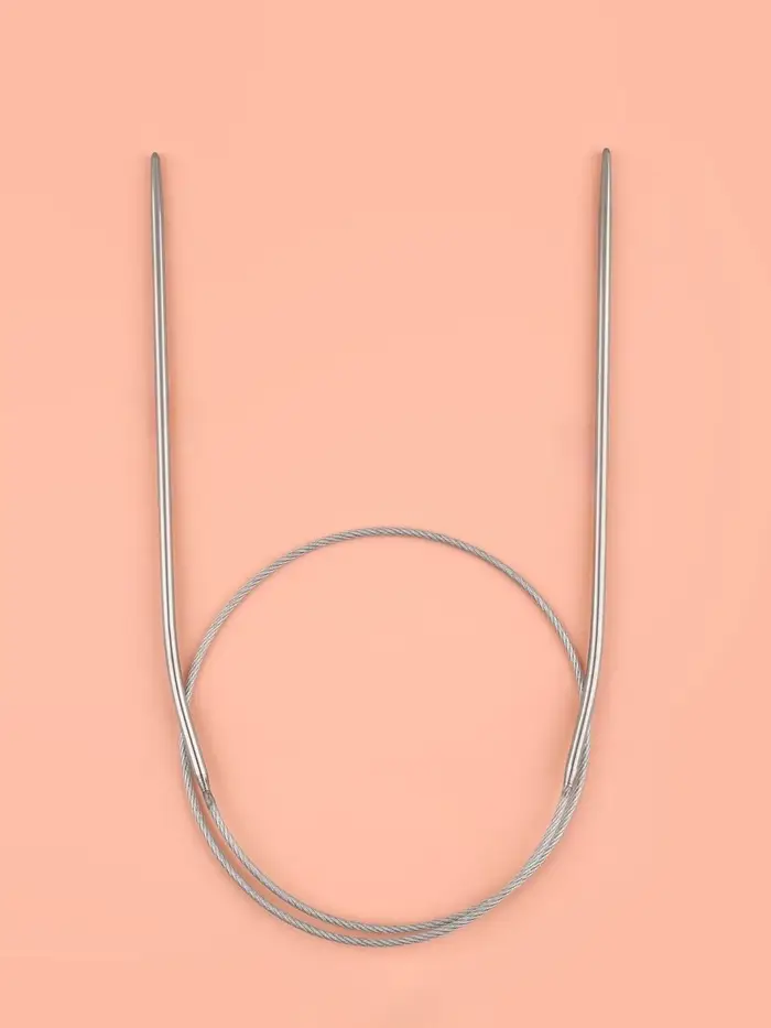 Круговые спицы представляют собой две металлические части, соединённые друг с другом тросиком. Инструмент незаменим при вязании полотна по кругу. С его помощью получаются изделия без дополнительных швов: шапки, рукава и горловины.