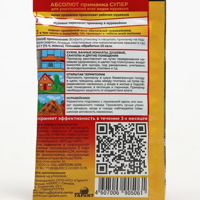 Инсектицидное средство Абсолют приманка супер rранулированная пищевая приманка для уничтожения тараканов, муравьев (рыжих домовых и различных видов садовых) и имаго мух.СОСТАВДействующим веществом является тиаметоксам - 0,2% - соединение кишечного, контактного и системного действия из rруппы неоникотиноидов. В состав средства входят также: вспомогательные инrредиенты, кон-сервант, стабилизатор, пищевые атrрактанты (мука, сахар и др.).СПОСОБ ПРИМЕНЕНИЯДля уничтожения рыжих тараканов приманку расставляют на под-ложках или в контейнерах в местах обитания, скопления или передвижения тараканов из расчета 1-2 шт (до 5г на каждой) на помещение 10-15 м2. Гибель тараканов наступает через 2-3 суток. Подложки можно перемещать в другие места, где обнаружены тараканы.Для уничтожения рыжих домовых муравьев на кухнях, в ванных, душевых, санузлах приманку расставляют на путях передвижения (дорожки) муравьев, исходя из нормы расхода 1-2 подложки (контейнера) на помещение площадью ~20 м2.Для уничтожения садовых муравьев, заползающих на нижние этажи строений, подложки размещают в местах скопления и на путях проникновения муравьев в помещение: на открытых верандах, террасах, крыше, вдоль порога и по периметру.Для уничтожения имаго мух размещают из расчета 3-5 штук (до 5 г приманки на каждой) на помещение площадью до 15 м2 в местах наибольшего скопления мух желательно на верхних крышках подвесных шкафов, ящиков, холодильников, прочего оборудования и предметов мебели на высоте более 2м так, чтобы они не попали в поле зрения детей.