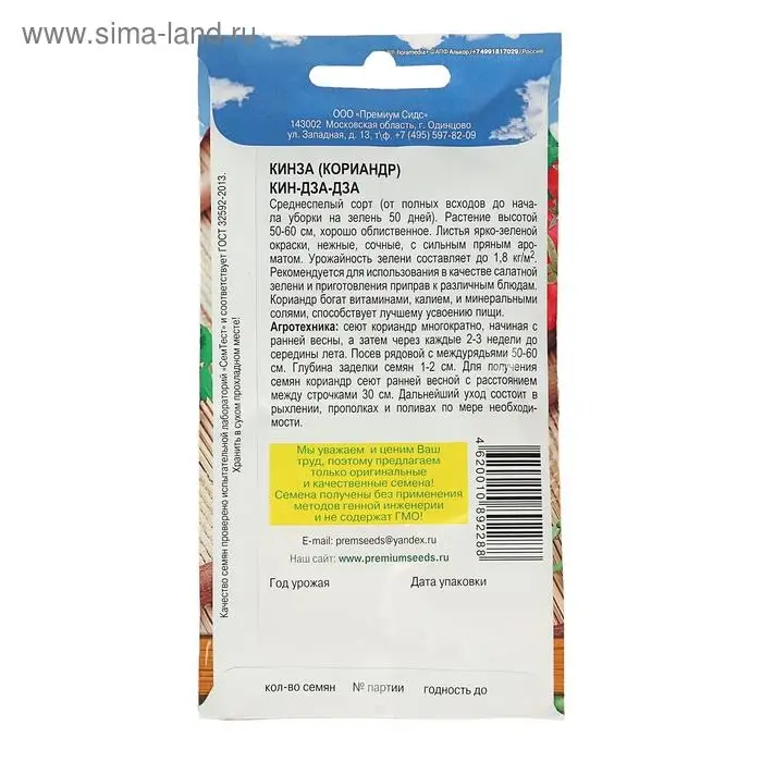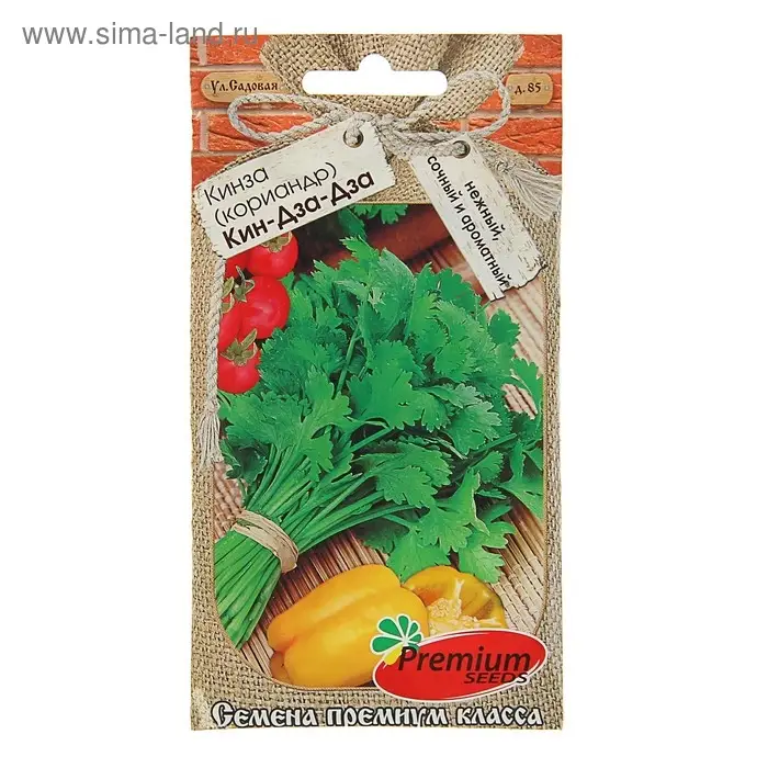 Среднеспелый сорт (от полных всходов до начала уборки на зелень 50 дней). Растение высотой 50-60 см, хорошо облиственное. Листья ярко- зеленой окраски, нежные, сочные, с сильным пряным ароматом. Урожайность зелени составляет до 1,8 кг/м2. Рекомендуется для использования в качестве салатной зелени и приготовления приправ к различным блюдам. Кориандр богат витаминами, калием, и минеральными солями, способствует лучшему усвоению пищи.