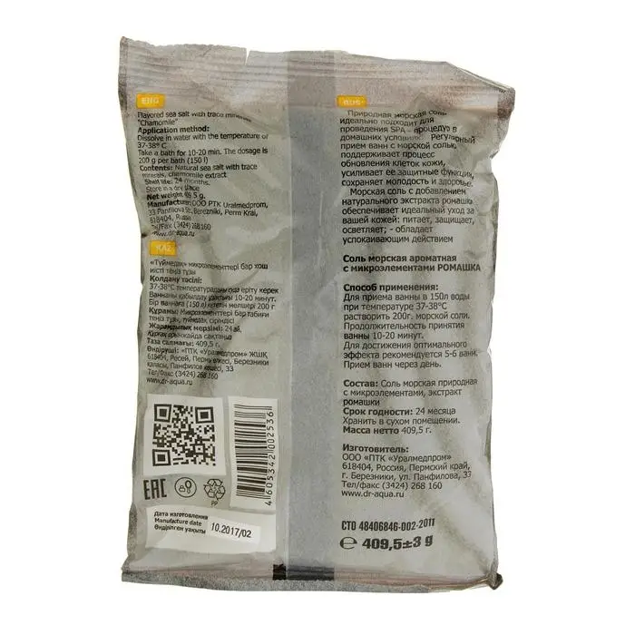 Состав: соль морская природная с микроэлементами, экстракт ромашки.