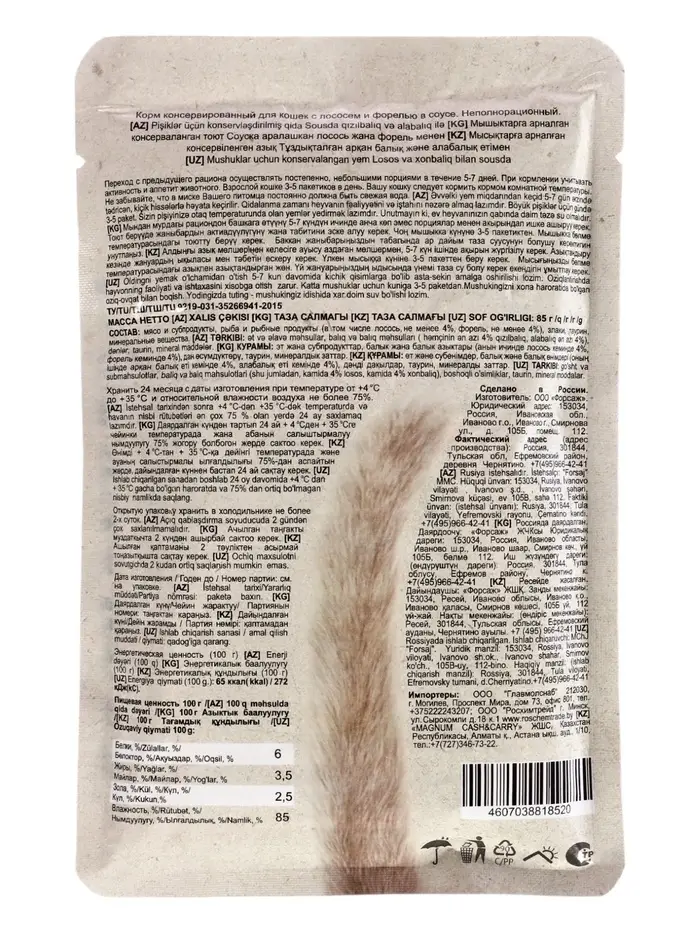Состав: мясо и субпродукты ( в том числе лосось и форель не менее 4%),злаки, таурин, минеральные вещества
