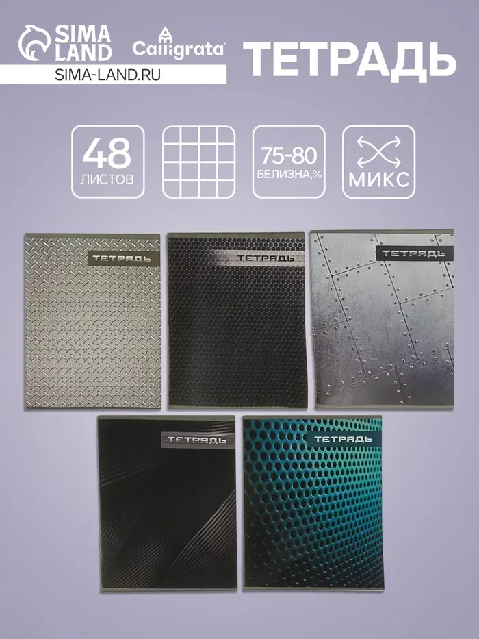 Тетрадь 48 листов в клетку Calligrata «Металл», обложка мелованный картон, блок №2, белизна 75% (серые листы), МИКС