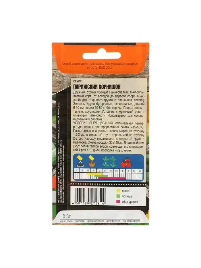 Семена Огурец "Парижский корнишон" раннеспелый, пчелоопыляемый, 0,3 г