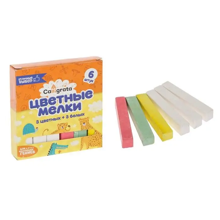 Мелки цветные Calligrata, в наборе 6 штук (3 белых + 3 цветных), квадратные